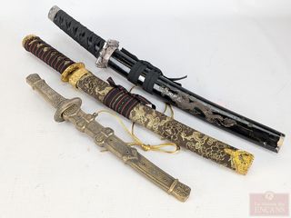 | #72 | Deux sabres courts et une dague avec fourreau en laiton, le plus grand mesurant 19 pouces de longueur au total Deux sabres courts et une dague avec fourreau en laiton, le plus grand mesurant 19 pouces de longueur au total | ||