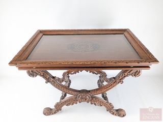 | #15 | Table anglaise Savonarola en bois, finement sculptée, datant du 19eme siècle et mesurant 20x26x17 pouces Table anglaise Savonarola en bois, finement sculptée, datant du 19eme siècle et mesurant 20x26x17 pouces | ||