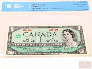 | #219 | Billet canadien d'un dollar 1967, gradé UNC-63 Billet canadien d'un dollar 1967, gradé UNC-63 | ||