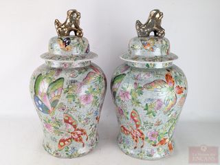 | #54 | Paire de vases chinois en céramique surmontés de foo-dogs, mesurant 21 pouces de hauteur Paire de vases chinois en céramique surmontés de foo-dogs, mesurant 21 pouces de hauteur | ||