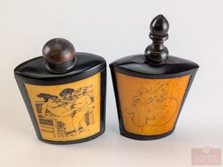 | #210 | Deux tabatières sculptées sur os avec gravures érotiques, la plus grande mesurant 3 pouces Deux tabatières sculptées sur os avec gravures érotiques, la plus grande mesurant 3 pouces | ||