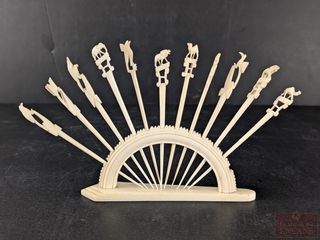 | #217 | Ensemble porte-cure-dents et cure-dents sculptés sur ivoire avec motifs d'animaux, circa 1950, mesurant 4 pouces de hauteur Ensemble porte-cure-dents et cure-dents sculptés sur ivoire avec motifs d'animaux, circa 1950, mesurant 4 pouces de hauteur | ||