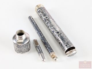 | #228 | Porte-plume et encrier de transport en argent ciselé avec motifs floraux, datant du 19eme siècle et mesurant 4.75 pouces de hauteur Porte-plume et encrier de transport en argent ciselé avec motifs floraux, datant du 19eme siècle et mesurant 4.75 pouces de hauteur | ||