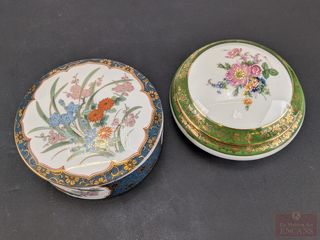 | #67 | Deux boites à bijoux, dont une japonaise et une en porcelaine de Limoges, peintes à la main, la plus grande mesurant 5 pouces de diamètre Deux boites à bijoux, dont une japonaise et une en porcelaine de Limoges, peintes à la main, la plus grande mesurant 5 pouces de diamètre | ||