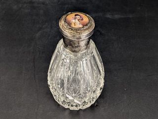 | #109 | Bouteille à parfum autrichienne en cristal pinwheel avec bouchon en argent orné d'une porcelaine peinte à la main, circa 1920, mesurant 5 pouces de hauteur Bouteille à parfum autrichienne en cristal pinwheel avec bouchon en argent orné d'une porcelaine peinte à la main, circa 1920, mesurant 5 pouces de hauteur | ||