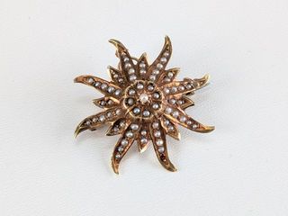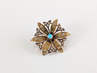 | #87 | Broche-pendentif victorien en or 14k serti de perles, circa 1880, mesurant 1.25 pouces de largeur Broche-pendentif victorien en or 14k serti de perles, circa 1880, mesurant 1.25 pouces de largeur | ||