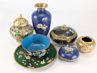 | #26 | Lot de cloisonnés vintages en laiton, dont un vase mesurant 6 pouces de hauteur Lot de cloisonnés vintages en laiton, dont un vase mesurant 6 pouces de hauteur | ||
