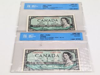 | #93 | Deux billets de remplacement canadiens d'un dollar 1954 consécutifs, incirculés et gradés UNC-64 Deux billets de remplacement canadiens d'un dollar 1954 consécutifs, incirculés et gradés UNC-64 | ||