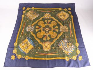 | #69 | Carré de soie Hermès modèle Les tambours de la garde nationale, mesurant 35x35 pouces Carré de soie Hermès modèle Les tambours de la garde nationale, mesurant 35x35 pouces | ||