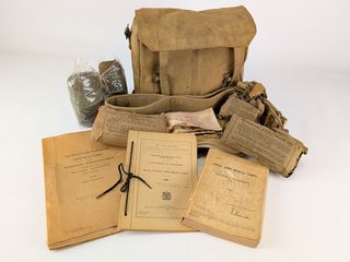 | #50 | Sac de médecin militaire de la Croix Rouge en tissu avec manuels, bandages, brassard et rare ceinture, datant de la deuxième guerre mondiale et mesurant 10 pouces de largeur Sac de médecin militaire de la Croix Rouge en tissu avec manuels, bandages, brassard et rare ceinture, datant de la deuxième guerre mondiale et mesurant 10 pouces de largeur | ||