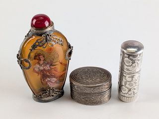| #92 | Bouteille à priser en verre et métal, peinte à la main de l'intérieur et mesurant 3 pouces de hauteur, ainsi que deux piluliers en métal ciselé, le plus grand mesurant 2 pouces de hauteur Bouteille à priser en verre et métal, peinte à la main de l'intérieur et mesurant 3 pouces de hauteur, ainsi que deux piluliers en métal ciselé, le plus grand mesurant 2 pouces de hauteur | ||