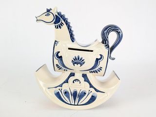 | #60 | Banque en porcelaine Rosenthal design Bjorn Wiinblad, représentant un cheval à bascule, faite en Allemagne et mesurant 6.5 pouces de hauteur, avec sa clef Banque en porcelaine Rosenthal design Bjorn Wiinblad, représentant un cheval à bascule, faite en Allemagne et mesurant 6.5 pouces de hauteur, avec sa clef | ||