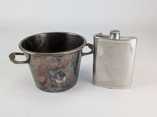 | #11 | Seau à bouteille et flasque vintages, la flasque mesurant 5.5 pouce de hauteur Seau à bouteille et flasque vintages, la flasque mesurant 5.5 pouce de hauteur | ||