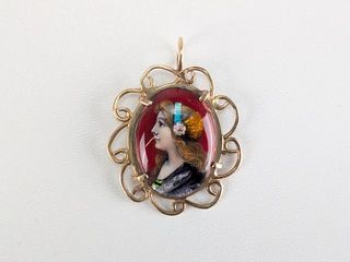 | #74 | Broche française de Limoges en or 10k sertie d'un émail sur cuivre, peinte à la main et mesurant 1.25 pouces de hauteur Broche française de Limoges en or 10k sertie d'un émail sur cuivre, peinte à la main et mesurant 1.25 pouces de hauteur | ||