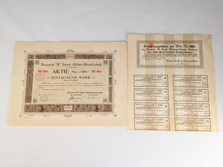 | #116 | Deux certificats d'actions de brasseries allemandes, datant de 1921 Deux certificats d'actions de brasseries allemandes, datant de 1921 | ||