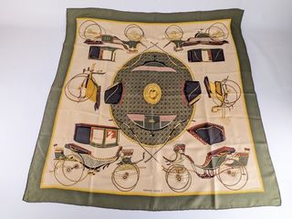| #95 | Carré de soie Hermès modèle Les voitures à transformation, mesurant 34x34 pouces Carré de soie Hermès modèle Les voitures à transformation, mesurant 34x34 pouces | ||