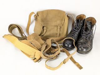 | #53 | Sac, courroies et paire de bottes militaires de l'armée canadienne, datant de la seconde guerre mondiale Sac, courroies et paire de bottes militaires de l'armée canadienne, datant de la seconde guerre mondiale | ||