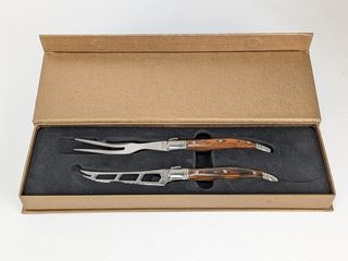 | #104 | Ensemble de couteau et fourchette à fromage Laguiole par Trudeau avec manches en bois, neufs, dans leur boite Ensemble de couteau et fourchette à fromage Laguiole par Trudeau avec manches en bois, neufs, dans leur boite | ||
