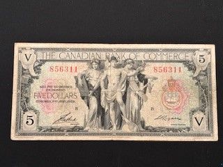 | #44 | Billet de 5$ 1935 ‘Banque de Commerce’ (en bonne condition) Billet de 5$ 1935 ‘Banque de Commerce’ (en bonne condition) | SOLD – CAD$ 100.00 | |