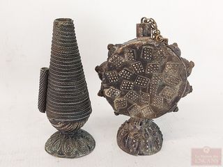| #199 | Deux anciennes bouteilles moyen-orientales pour khôl en métal, la plus grande mesurant 4 pouces de hauteur Deux anciennes bouteilles moyen-orientales pour khôl en métal, la plus grande mesurant 4 pouces de hauteur | VENDU – CAD$ 25.00 | |