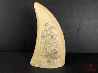 | #216 | Reproduction d'une œuvre Scrimshaw (sculpture sur dent de baleine) mesurant 7.5 pouces de hauteur Reproduction d'une œuvre Scrimshaw (sculpture sur dent de baleine) mesurant 7.5 pouces de hauteur | ||