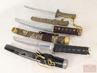 | #142 | Lot de sabres orientaux, dont un en laiton mesurant 14 pouces de longueur au total Lot de sabres orientaux, dont un en laiton mesurant 14 pouces de longueur au total | ||