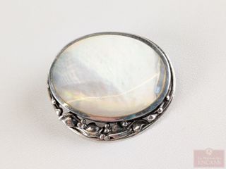 | #187 | Broche en argent sertie de nacre de perle, mesurant 1.5 pouces de hauteur Broche en argent sertie de nacre de perle, mesurant 1.5 pouces de hauteur | ||