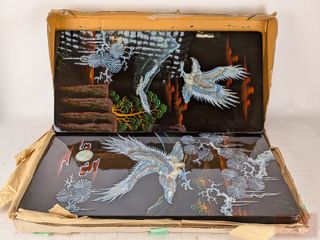 | #164 | Quatre appliques murales orientales en bois laqué avec incrustations de nacre de perles, mesurant 11.5x23.5 pouces chacune Quatre appliques murales orientales en bois laqué avec incrustations de nacre de perles, mesurant 11.5x23.5 pouces chacune | ||