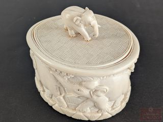 | #214 | Boite à bijoux sculptée sur ivoire avec motifs d'éléphants, circa 1940, mesurant 4 pouces de largeur Boite à bijoux sculptée sur ivoire avec motifs d'éléphants, circa 1940, mesurant 4 pouces de largeur | ||