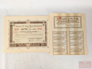 | #201 | Deux certificats d'actions de brasseries allemandes, datant de 1921 Deux certificats d'actions de brasseries allemandes, datant de 1921 | ||