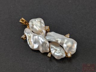 | #209 | Pendentif Birks en or 18k, serti de diamants avec nacre de perle, mesurant 2 pouces de hauteur Pendentif Birks en or 18k, serti de diamants avec nacre de perle, mesurant 2 pouces de hauteur | ||