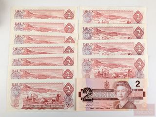 | #64 | Lot de trente billets canadiens de deux dollars 1986, incirculés Lot de trente billets canadiens de deux dollars 1986, incirculés | ||
