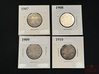 4 Pièces de 25 Cents 1907-1908-1909-1910 en Argent