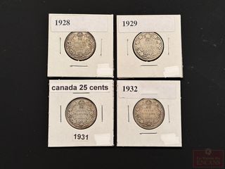 | #196 | 4 Pièces de 25 Cents 1928-1929-1931-1932 en Argent