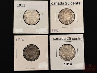 | #194 | 4 Pièces de 25 Cents 1911-1912-1913-1914 en Argent .925