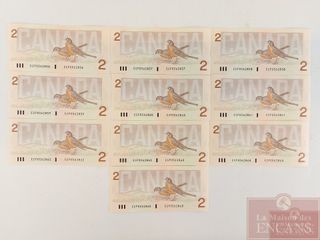 | #25 | Lot de 10 billets de 2 dollars canadiens avec numéros de séries consécutifs - incirculés