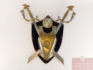Lot décoratif - blason portant - deux épées mesurant 27 pouces - et une armure