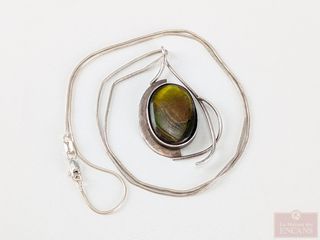 | #174 | Pendentif en argent serti d'une amolite, mesurant 1.25 pouces de hauteur, avec sa chaine en argent mesurant 20 pouces de longueur Pendentif en argent serti d'une amolite, mesurant 1.25 pouces de hauteur, avec sa chaine en argent mesurant 20 pouces de longueur | ||