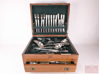 | #218 | Ensemble de coutellerie Argental dans un coffre Birks mesurant 20 pouces de largeur Ensemble de coutellerie Argental dans un coffre Birks mesurant 20 pouces de largeur | ||