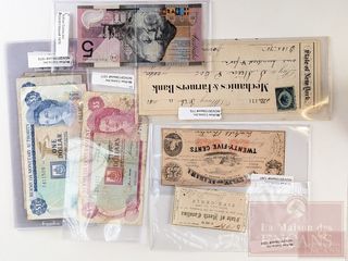 | #157 | Lot de billets comprenant State of Alabama 1863, State of North Carolina 1861, billet australien de cinq dollars, quatre billets d'un dollar 1978 des Bermudes, un billet de cinq dollars 1970 des Bermudes, ainsi qu'un billet de la Mechanics and Farmers Bank, State of New-York 1881 Lot de billets comprenant State of Alabama 1863, State of North Carolina 1861, billet australien de cinq dollars, quatre billets d'un dollar 1978 des Bermudes, un billet de cinq dollars 1970 des Bermudes, ainsi qu'un billet de la Mechanics and Farmers Bank, State of New-York 1881 | ||