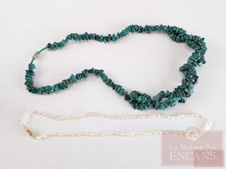 | #149 | Collier de malachite mesurant 20 pouces de longueur et pesant plus de 100 grammes, ainsi qu'un collier de perles d'eau douce mesurant 16 pouces de longueur Collier de malachite mesurant 20 pouces de longueur et pesant plus de 100 grammes, ainsi qu'un collier de perles d'eau douce mesurant 16 pouces de longueur | ||