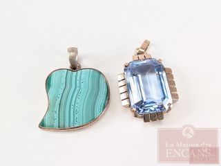 | #171 | Pendentif art-déco en or 9k, serti d'une pierre et mesurant 1 pouce de hauteur, ainsi qu'un pendentif en argent et malachite Pendentif art-déco en or 9k, serti d'une pierre et mesurant 1 pouce de hauteur, ainsi qu'un pendentif en argent et malachite | ||