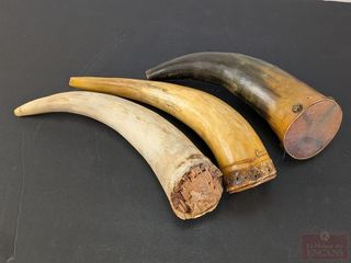| #222 | Lot de trois anciennes corne à poudre sculptées, la plus grande mesurant 10 pouces de longueur Lot de trois anciennes corne à poudre sculptées, la plus grande mesurant 10 pouces de longueur | ||