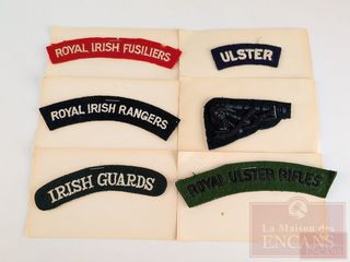 | #182 | Lot d'écussons militaires de l'armée irlandaise, comprenant Irish Guards, Royal Irish Rangers, Royal Ulster Rifles et Royal Irish Fusiliers Lot d'écussons militaires de l'armée irlandaise, comprenant Irish Guards, Royal Irish Rangers, Royal Ulster Rifles et Royal Irish Fusiliers | ||