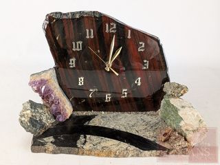 | #198 | Horloge avec base en pierres, dont géode d'améthyste, pyrite, rubis, quartz, granite et autres, mesurant 13 pouces de largeur Horloge avec base en pierres, dont géode d'améthyste, pyrite, rubis, quartz, granite et autres, mesurant 13 pouces de largeur | ||