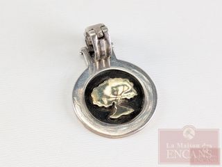 | #153 | Pendentif en or 18k et argent sterling, mesurant 1.5 pouces de hauteur Pendentif en or 18k et argent sterling, mesurant 1.5 pouces de hauteur | ||