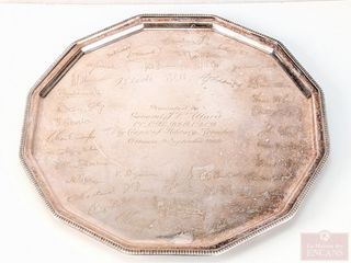 | #220 | Assiette en métal réalisée par l'orfèvre Garrard and Co., offerte au général Jean Victor Allard, avec les signatures des militaires gravées à la main, mesurant 10x10 pouces Assiette en métal réalisée par l'orfèvre Garrard and Co., offerte au général Jean Victor Allard, avec les signatures des militaires gravées à la main, mesurant 10x10 pouces | ||