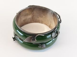 Exceptionnel et ancien bracelet art nouveau en argent massif fait avec deux bracelets de jade - mesurant 2.5 pouces de diamètre et 1.5 pouces de larguer - pesant plus de 150 grammes