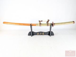| #47 | Katana affuté avec son fourreau en bois et son support, le katana mesurant 41 pouces de longueur au total Katana affuté avec son fourreau en bois et son support, le katana mesurant 41 pouces de longueur au total | ||