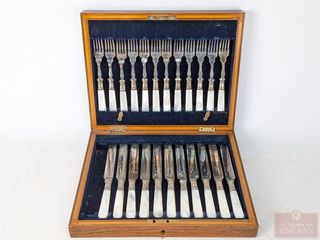 | #174 | Ensemble de coutellerie anglaise à manches en nacre de perle et bagues en argent, circa 1900, comprenant couteaux et fourchettes, dans leur coffret mesurant 11.5 pouces Ensemble de coutellerie anglaise à manches en nacre de perle et bagues en argent, circa 1900, comprenant couteaux et fourchettes, dans leur coffret mesurant 11.5 pouces | ||
